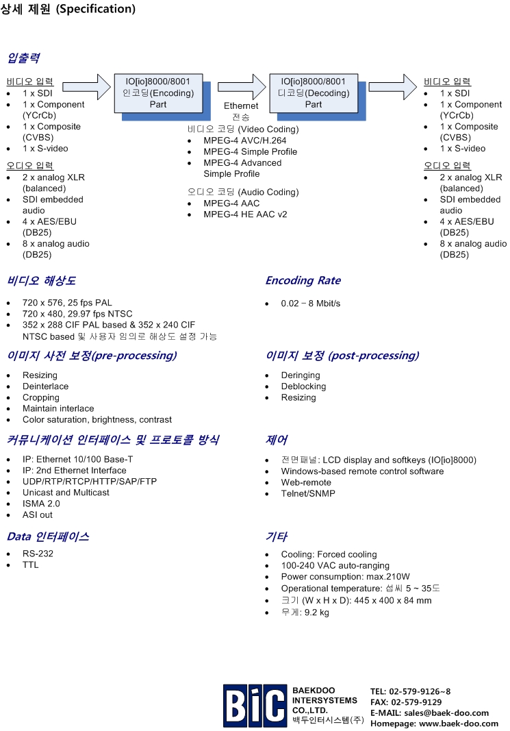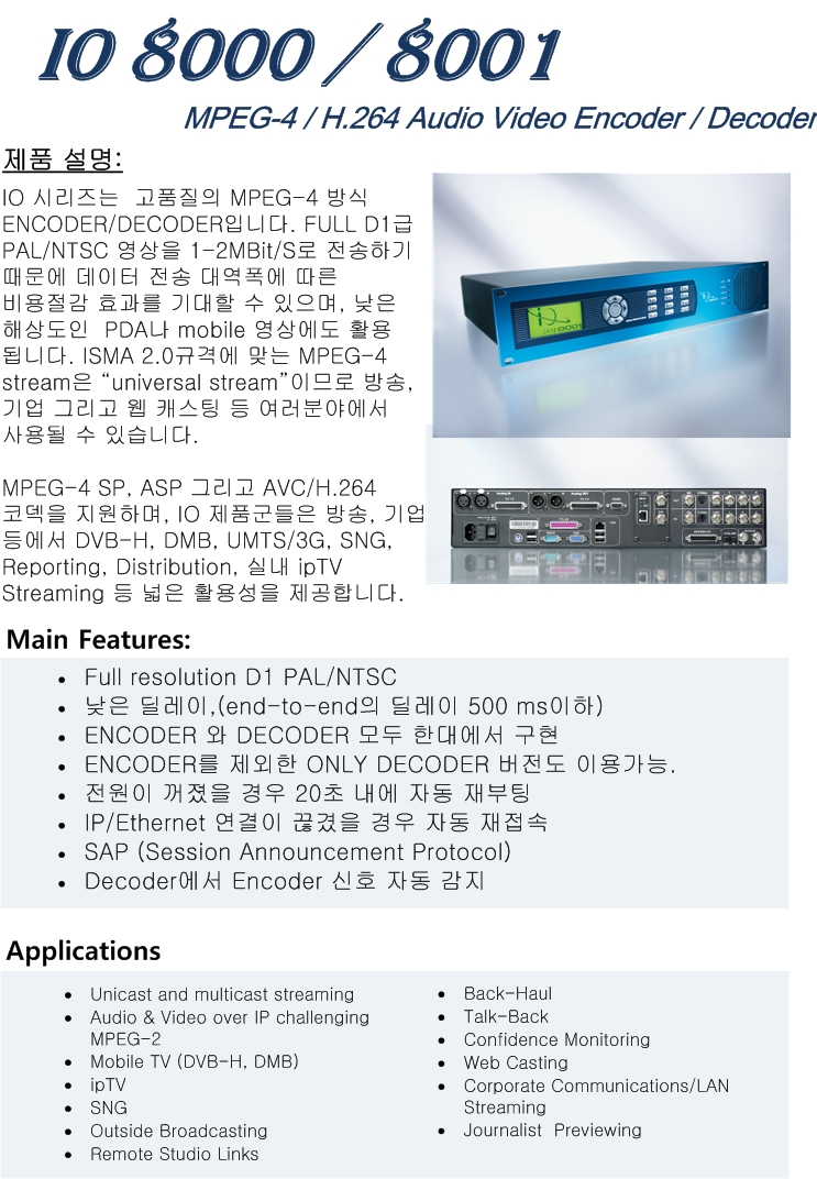 IO 8000/8001 ½Ã¸®Áî´Â °íǰÁúÀÇ MPEG-4 ¹æ½Ä Encoder/DecoderÀ¸·Î½á ¹æ¼Û,±â¾÷ ±×¸®°í À¥ ij½ºÆÃ µî ¿©·¯ºÐ¾ß¿¡¼ »ç¿ëÇÒ ¼ö ÀÖ´Â Á¦Ç°ÀÔ´Ï´Ù