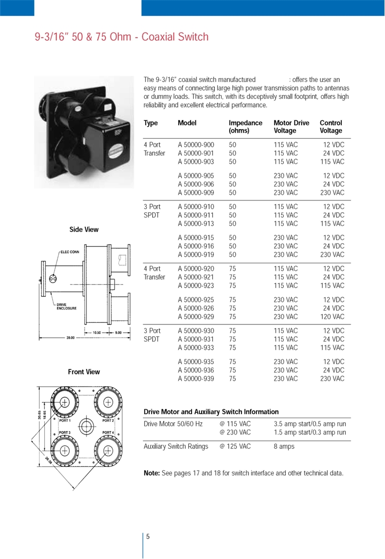 1. Ä¿³ØÅÍ »çÀÌÁî: 9-3/16" 2. Port ¼ö: 3,4°³ 3. Drive motor (50/60Hz) Àü¿ø»ç¾ç 230VAC (1.5amps/0.3ampr) 115VAC (3.5amps/0.5ampr) 4. ¿ÜºÎ ¿ø°ÝÁ¶Á¤ ½ºÀ§Ä¡ Àü¿ø»ç¾ç: 125VAC (8amps) 5. Impedence: 50 & 75 ohm
