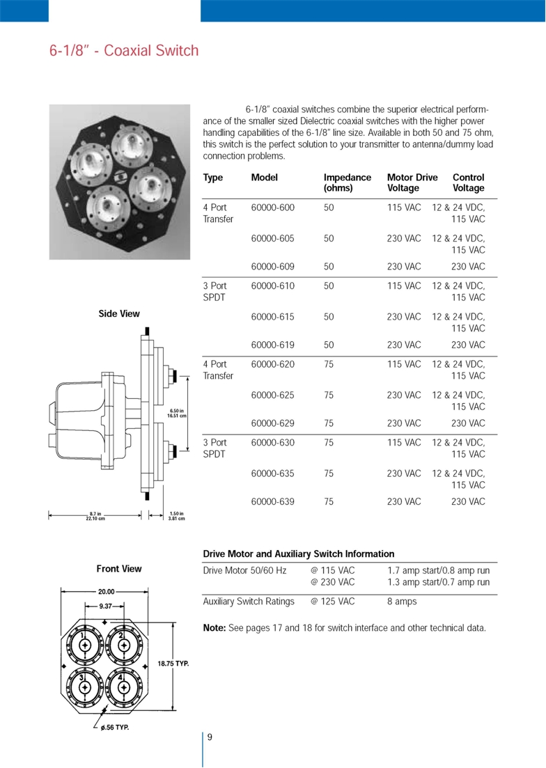 1. Ä¿³ØÅÍ »çÀÌÁî: 6-1/8" 2. Port ¼ö: 3,4°³ 3. Drive motor (50/60Hz) Àü¿ø»ç¾ç 230VAC (1.3amps/0.7 ampr) 115VAC (1.7amps/0.8 ampr) 4. ¿ÜºÎ ¿ø°ÝÁ¶Á¤ ½ºÀ§Ä¡ Àü¿ø»ç¾ç: 125VAC (8amps) 5. Impedence: 50 & 75 ohm